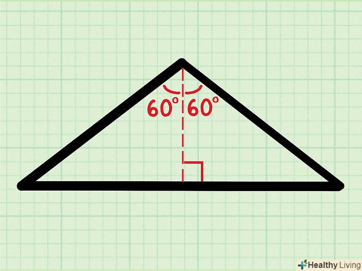 Розділіть рівнобедрений трикутник на два рівних прямокутних трикутника.для цього опустіть перпендикуляр (висоту) з вершини трикутника, Яка утворена двома рівними сторонами, на підставу.- Висота ділить кут θ рівно навпіл. Таким чином, один з кутів прямокутного трикутника дорівнює ½θ, а в нашому прикладі ( ½ ) (120) = 60°.