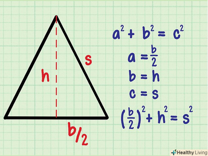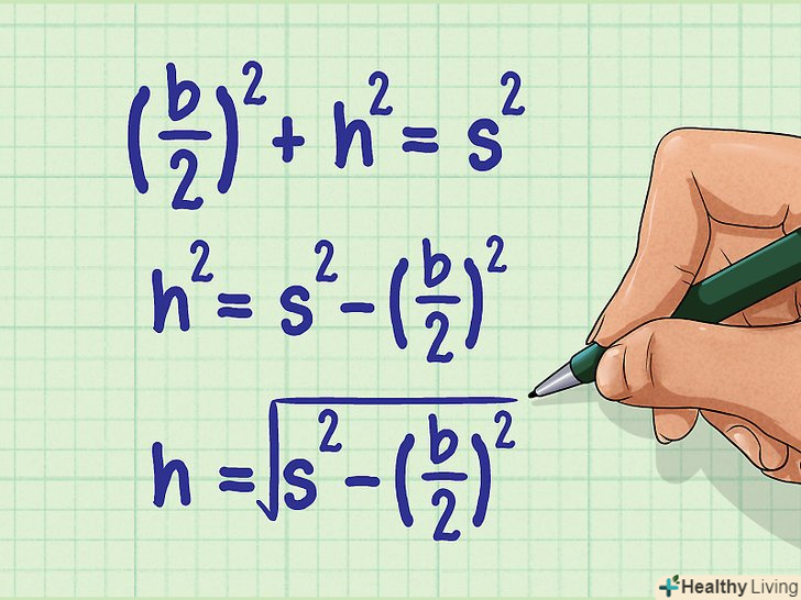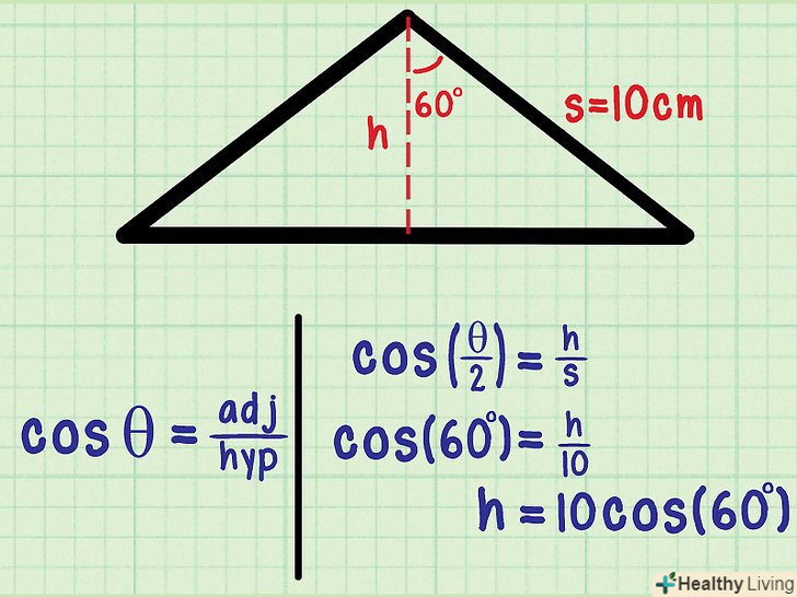 Обчисліть висоту " h " за допомогою тригонометричних функцій.до прямокутного трикутника можна застосувати наступні тригонометричні функції: sin (синус), cos (косинус) і tg (тангенс). У нашому прикладі відома гіпотенуза "s«; потрібно знайти» h", тобто катет, прилеглий до відомого кутку. Згадайте, що косинус = прилеглий катет / гіпотенуза.- Cos(θ/2) = h/s