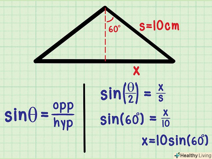 Обчисліть значення другого катета.тепер ми не знаємо значення другого катета прямокутного трикутника; позначимо його як «x». Згадайте, що синус = протилежний катет / гіпотенуза.- Sin(θ/2) = x/s
