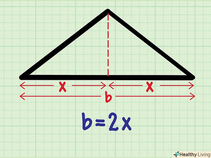 Зверніть увагу, що другий катет прямокутного трикутника дорівнює половині підстави рівнобедреного трикутника. тобто b = 2x, тому що висота (перший катет) розділила підставу навпіл (на два катети, кожен з яких дорівнює значенню «x»).