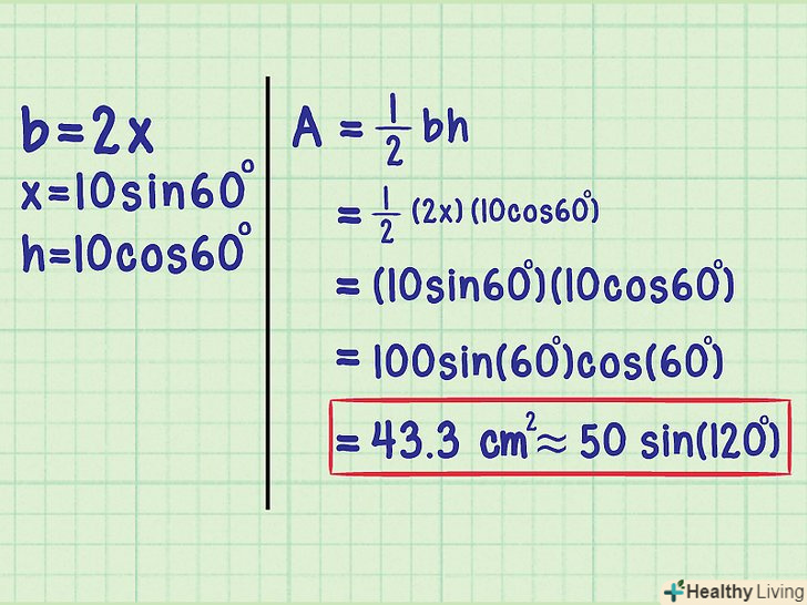 Підставте значення " h "і» b" в формулу для обчислення площі.тепер, коли ви знаєте основу і висоту, підставте їх у формулу S = ½:- Якщо обчислити синус і косинус на калькуляторі, ви знайдете, що S ≈ 43,3 см2. Якщо хочете, скористайтеся властивостями тригонометричних функцій, спростіть відповідь і запишіть його так: S = 50sin(120°).