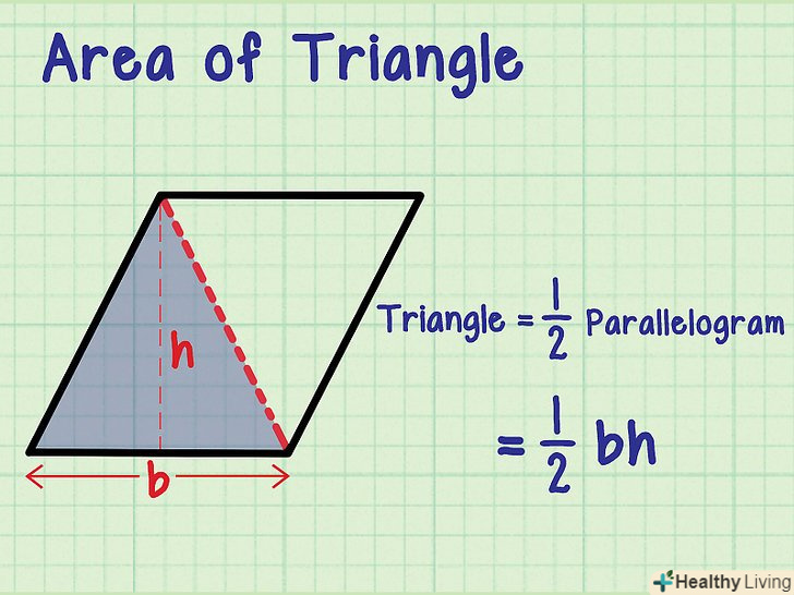 Порівняйте трикутники і паралелограми. Між цими фігурами існує проста зв'язок. Якщо будь-який паралелограм розрізати по діагоналі, вийдуть два рівних трикутника. Аналогічно, якщо скласти два рівних трикутника, вийде паралелограм. Тому Площа будь-якого трикутника обчислюється за формулою: S =½, що становить половину площі паралелограма.