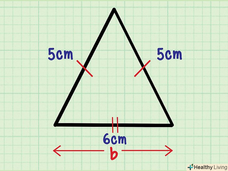 Знайдіть основу рівнобедреного трикутника.тепер ви знаєте формулу для обчислення площі трикутника; залишилося з'ясувати, що таке «підстава» і «висота». Підстава (позначається як «b») – Це сторона, яка не дорівнює двом іншим (рівним) сторонам.- Наприклад, якщо сторони рівнобедреного трикутника рівні 5 см, 5 см, 6 см, в якості підстави виберіть сторону, яка дорівнює 6 см.