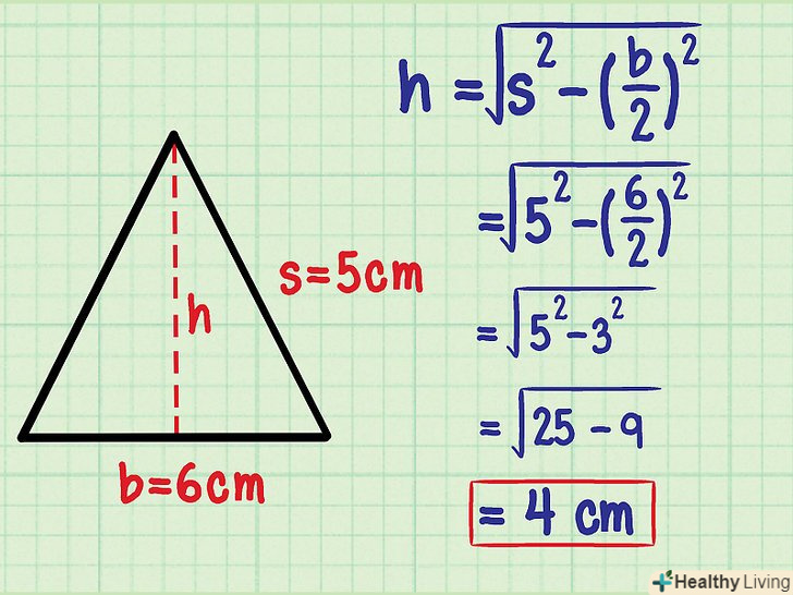 - У деяких завданнях будуть дані інші величини, наприклад, підстава і один кут рівнобедреного трикутника. В цьому випадку дійте так само: розділіть рівнобедрений трикутник на два рівних прямокутних трикутника, а потім знайдіть висоту за допомогою тригонометричних функцій.