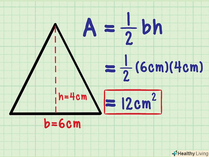 Підставте значення підстави і висоти в формулу для обчислення площі трикутника. Формула: S = ½bh; підставте в неї значення» b «і» h " і обчисліть площу. У відповіді не забудьте написати квадратні одиниці виміру.- У нашому прикладі підстава дорівнює 6 см, а висота дорівнює 4 см.