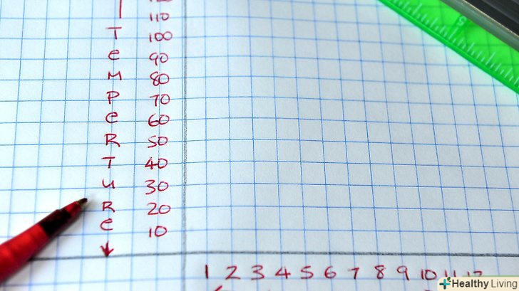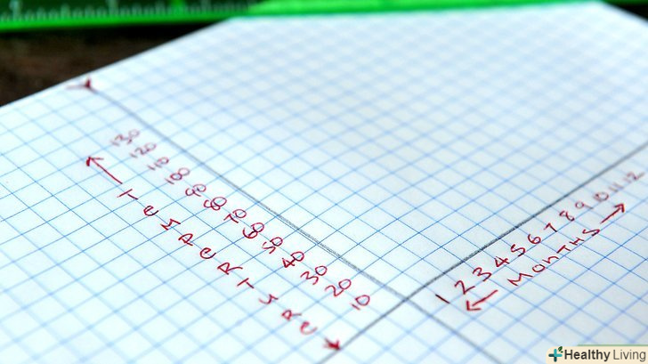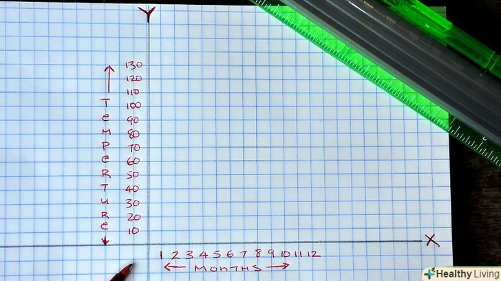 Вирішіть, скільки значень буде складати кожен поділ на осі.наприклад, ви можете побажати відзначити по осі температури y ділення в 10 градусів Фаренгейта (-12,22 градусів Цельсія), а по осі часу X – ділення, рівні одному місяцю.- Підпишіть нанесені на осі ділення їх відповідним значеннями. Вам не обов'язково підписувати кожен поділ, часом досить підписати тільки великі рівновіддалені інтервали по осі.