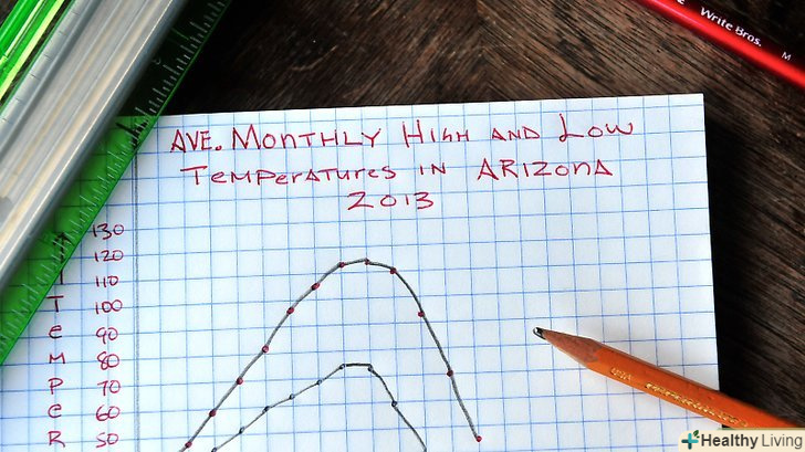 Внесіть свої дані в графік.наприклад, якщо висока температура становила в місті 40 градусів Фаренгейта (4,44 градуса Цельсія) в січні, знайдіть мітку січня на осі X і мітку "40 градусів" на осі Y. подумки продовжите ці Мітки до точки їх перетину і відзначте цю точку. Зробіть те ж саме для інших даних, поки не заповните графік.