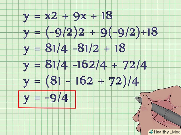 Підставте знайдене значення x у вихідне рівняння для обчислення значення y. Тепер, коли вам відомо значення x, просто підставте його у вихідне рівняння для знаходження y. Таким чином, формулу для знаходження вершини параболи можна записати у вигляді функції: (x, y) = [(-b/2A), f(-b/2a)]. Це означає, що для знаходження y необхідно спочатку знайти x за формулою, а потім підставити значення x у вихідне рівняння. Ось, як це робиться:- Y = x2 + 9x + 18
