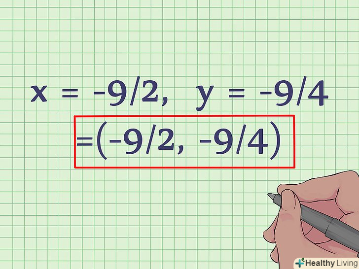 Запишіть значення x і y у вигляді пари координат.тепер, коли вам відомо, що x = -9/2, А y = -9/4, запишіть їх як координати у вигляді: (-9/2, -9/4). Вершина параболи знаходиться за координатами (-9/2, -9/4). Якщо вам потрібно намалювати цю параболу, то її вершина лежить в нижній точці, так як коефіцієнт при x2 позитивний.