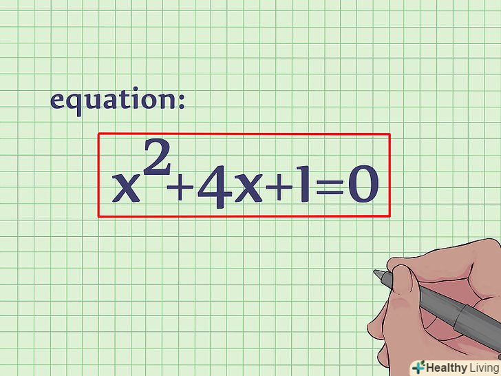 Запишіть рівняння.Доповнення до повного квадрата-ще один спосіб знайти вершину параболи. Застосувавши цей метод, ви знайдете координати x і y відразу, без необхідності підставляти x в вихідне рівняння. Наприклад, дано рівняння: x 2 + 4x + 1 = 0.[2]