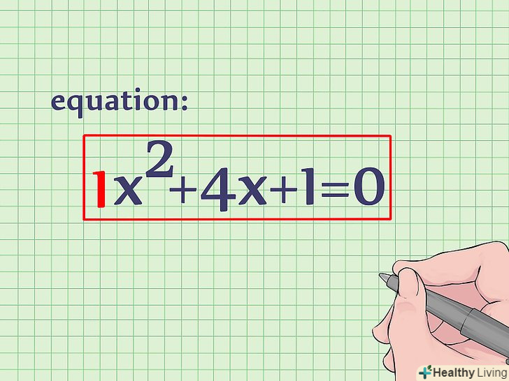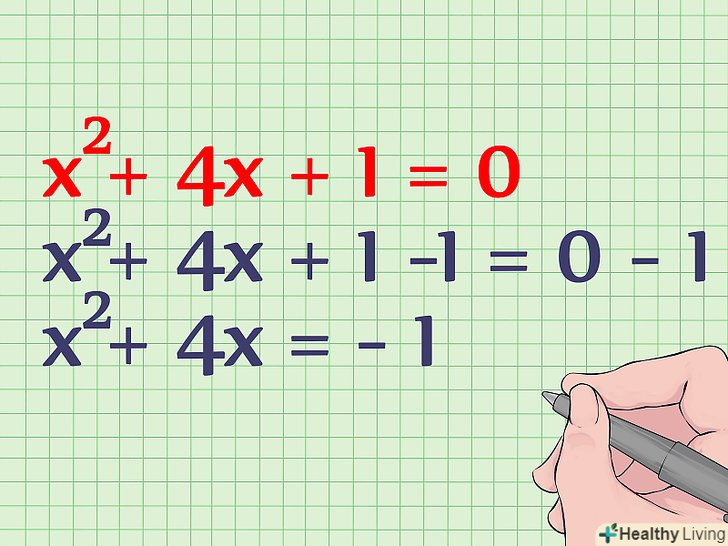 Перенесіть постійну в праву частину рівняння. постійна-коефіцієнт без змінної. Тут це 1. Перенесіть 1 вправо шляхом віднімання 1 з обох частин рівняння. Ось, як це зробити:[3]- X2 + 4x + 1 = 0