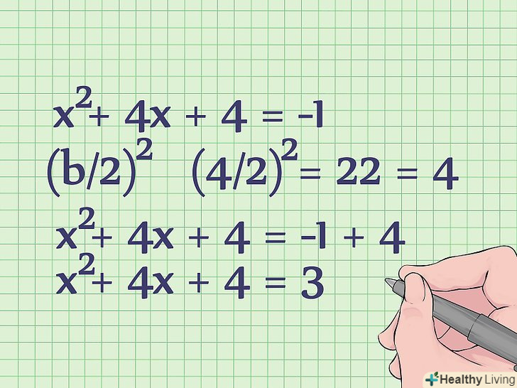 Доповніть до повного квадрата ліву частину рівняння. для цього просто знайдіть (b/2)2 і додайте результат до обох частин рівняння. Підставте 4 замість b , так як 4X — це коефіцієнт B нашого рівняння.- (4/2)2 = 22 = 4. Тепер додайте 4 до обох частин рівняння і отримаєте: