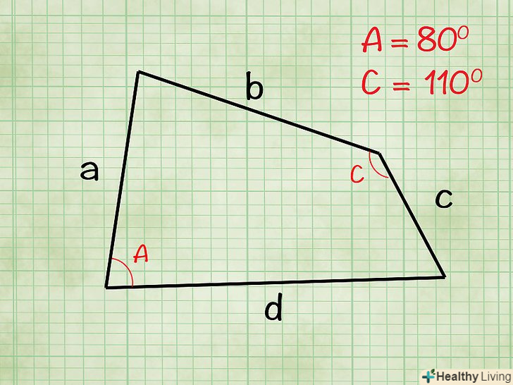 Знайдіть кут а між сторонами а і d і кут С між сторонами b і с (Ви можете знайти будь-які два протилежних кута).- У нашому чотирикутнику А = 80 градусів і C = 110 градусів.