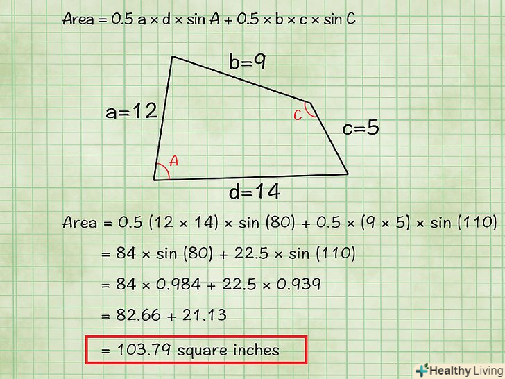 Уявіть, що існує відрізок, що з'єднує вершини, утворені сторонами а і b і сторонами с і D. цей відрізок розділить чотирикутник на два трикутника. Так як Площа трикутника дорівнює 1 / 2absinc, де C — Кут між сторонами a і b, ви можете знайти площі двох трикутників і скласти їх, щоб обчислити площу квадрата.- Площа = 0,5 х сторона1 х сторона4 х sin(кут між стороной1 і стороной4) + 0,5 х сторона2 х сторона3 х sin (кут між стороной2 і стороной3), або