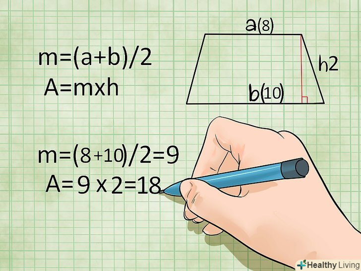 Знайдіть площу трапеції, використовуючи середню лінію. середня лінія-це відрізок, паралельний підстав і ділить бічні сторони навпіл. Середня лінія дорівнює середньому значенню від обох підстав (a і b): середня лінія = (a+b)/2.- Площа = середня лінія х висота, або S = m х