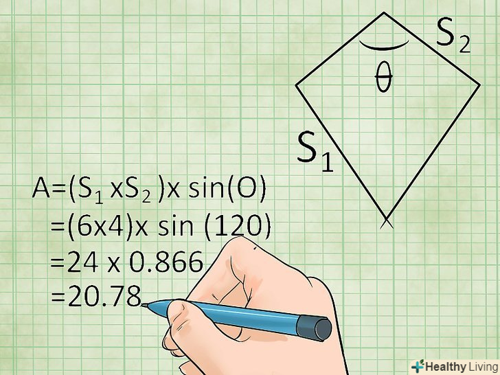 Знайдіть площу дельтоїда, використовуючи нерівні сторони і кут між ними. якщо ви знаєте нерівні сторони і кут між цими сторонами (θ), то площа дельтоїда обчислюється за допомогою тригонометрії за формулою:[4]- Площа = (сторона1 х сторона2) х sin (кут), або S = (a × b) × sin(θ), де θ — кут між нерівними сторонами.