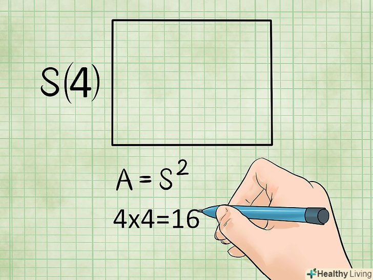 Площа квадрата. Квадрат-це окремий випадок прямокутника, тому використовуйте ту ж формулу, що і для знаходження площі прямокутника. Але в квадраті всі сторони рівні, тому площа квадрата дорівнює будь-який з його сторін, зведеної в квадрат (тобто помноженої саму на себе).[1]- Площа = сторона х сторона, або S = a2.