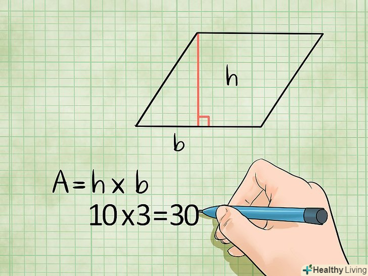 Площа ромба також можна знайти, якщо помножити його сторону на висоту, опущену на цю сторону.але не плутайте висоту з суміжною стороною. Висота-це пряма, опущена з будь-якої вершини ромба на протилежну сторону, і перетинає протилежну сторону під прямим кутом.- Якщо довжина ромба дорівнює 10 см, а його висота дорівнює 3 см, то площа такого ромба дорівнює 10 х 3 = 30 квадратних сантиметрів.