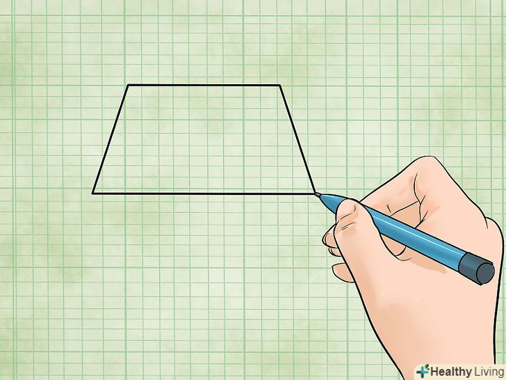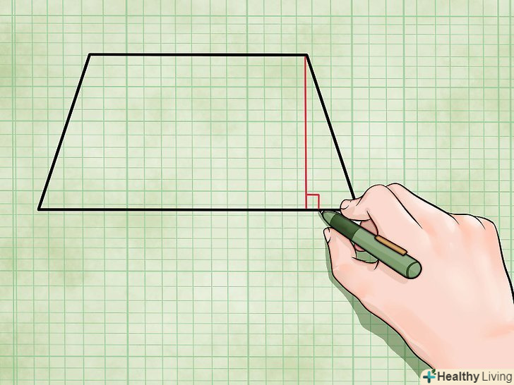 Знайдіть висоту трапеції.Висота трапеції-відрізок, що з'єднує паралельні сторони (підстави) і перетинає їх під прямим кутом (висота не дорівнює бічним сторонам). Ось як знайти висоту трапеції:[3]- З точки перетину меншого підстави і бічної сторони проведіть перпендикуляр до більшого підстави. Цей перпендикуляр і є висота трапеції.
