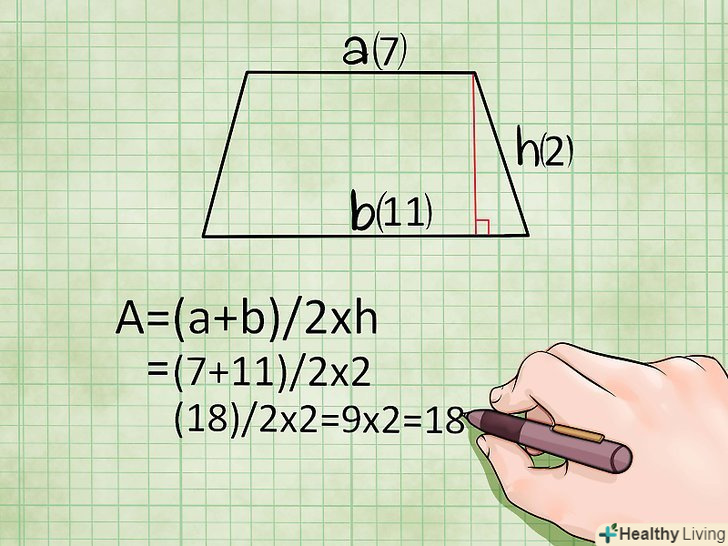 - Приклад: якщо середня лінія трапеції дорівнює 9 см, то площа цієї трапеції: S = m * h = 9 х 2 = 18 квадратних сантиметрів (ви отримали ту ж відповідь, що і в попередньому кроці).