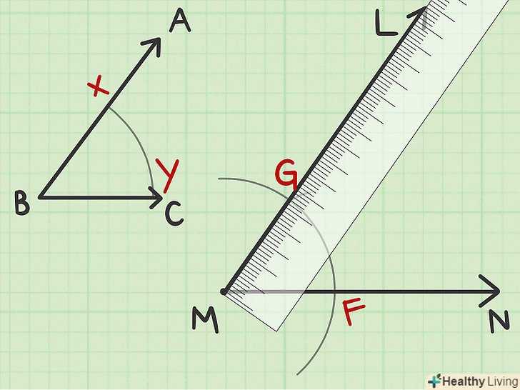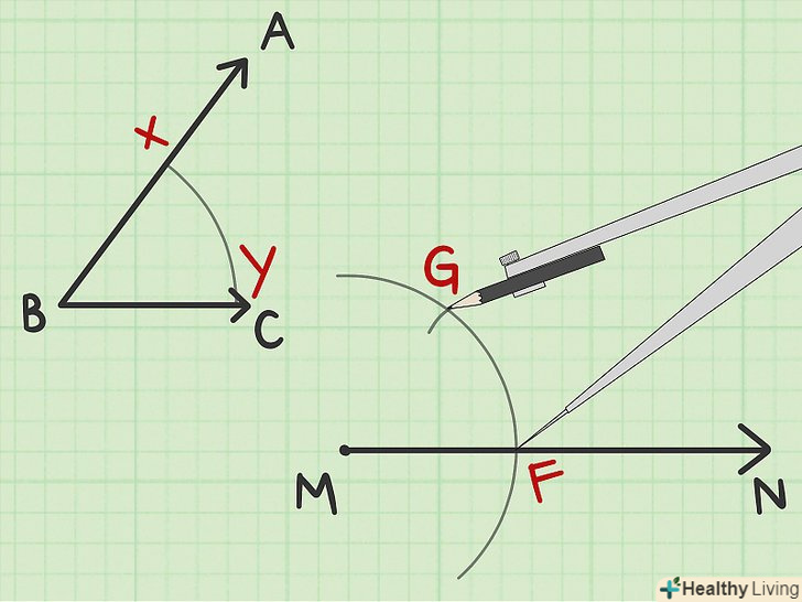 Поверніться до Рівного кута і відкладіть відстань ХУ.розчин циркуля не міняйте! Поставте голку циркуля в точці F і проведіть дугу, яка перетне раніше намальовану дугу. Перетин двох дуг позначте як G.[8] Поверніться до Рівного кута і відкладіть відстань ХУ.розчин циркуля не міняйте! Поставте голку циркуля в точці F і проведіть дугу, яка перетне раніше намальовану дугу. Перетин двох дуг позначте як G.[8]