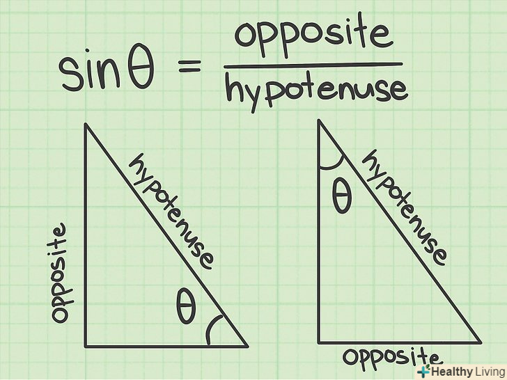 Зрозумійте, що означає "синус".Синус, косинус і тангенс кута-це основні тригонометричні функції, що зв'язують кути і сторони в прямокутному трикутнику. Синус кута дорівнює відношенню протилежної сторони до гіпотенузи. Позначається синус як Sin .[7] Зрозумійте, що означає "синус".Синус, косинус і тангенс кута-це основні тригонометричні функції, що зв'язують кути і сторони в прямокутному трикутнику. Синус кута дорівнює відношенню протилежної сторони до гіпотенузи. Позначається синус як Sin .[7]