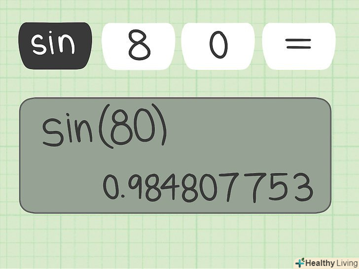 Навчіться обчислювати синус. щоб обчислити синус, на калькуляторі знайдіть клавішу Sin , натисніть її, а потім введіть значення кута. У деяких калькуляторах спочатку потрібно натиснути клавішу переходу до роботи з функціями, а потім натиснути клавішу Sin. Тому поекспериментуйте з калькулятором або перевірте його документацію. Навчіться обчислювати синус. щоб обчислити синус, на калькуляторі знайдіть клавішу Sin , натисніть її, а потім введіть значення кута. У деяких калькуляторах спочатку потрібно натиснути клавішу переходу до роботи з функціями, а потім натиснути клавішу Sin. Тому поекспериментуйте з калькулятором або перевірте його документацію.- Щоб знайти синус кута в 80 градусів, натисніть "sin», «8», «0», «=» або натисніть" 8», «0», « sin», " = " (відповідь: -0,9939).