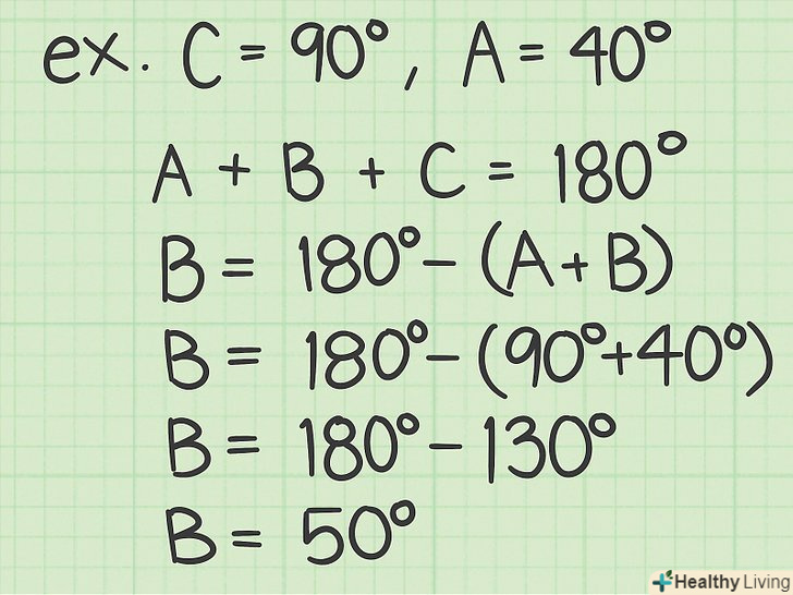 Знайдіть третій кут. якщо вам дано один з гострих кутів прямокутного трикутника (А або В), а другий кут завжди дорівнює 90 градусам (С = 90), то третій кут обчислюється за формулою 180 - (90 + А) = B (пам'ятайте, що сума кутів в будь-якому трикутнику дорівнює 180 градусам). При необхідності рівняння можна змінити і так: 180 - (90 + B) = A. Знайдіть третій кут. якщо вам дано один з гострих кутів прямокутного трикутника (А або В), а другий кут завжди дорівнює 90 градусам (С = 90), то третій кут обчислюється за формулою 180 - (90 + А) = B (пам'ятайте, що сума кутів в будь-якому трикутнику дорівнює 180 градусам). При необхідності рівняння можна змінити і так: 180 - (90 + B) = A.- Наприклад, якщо кутA = 40 градусам, то B = 180 - (90 + 40) = 180 - 130 = 50 градусів.