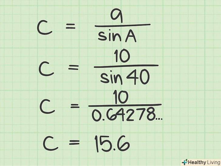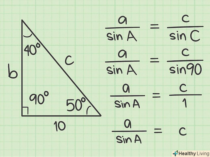 Підставте дані і знайдені значення в теорему синусів, щоб знайти гіпотенузу:Катет «а»/синус кута «A» = гіпотенуза «с»/синус кута «С». При цьому sin 90 = 1. Таким чином, рівняння спрощується до: А/sinA = с/1або С = а/sinA. Підставте дані і знайдені значення в теорему синусів, щоб знайти гіпотенузу:Катет «а»/синус кута «A» = гіпотенуза «с»/синус кута «С». При цьому sin 90 = 1. Таким чином, рівняння спрощується до: А/sinA = с/1або С = а/sinA.