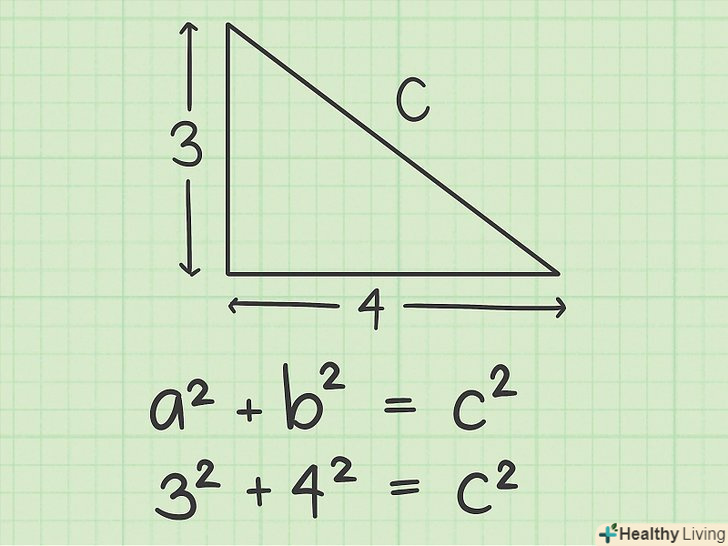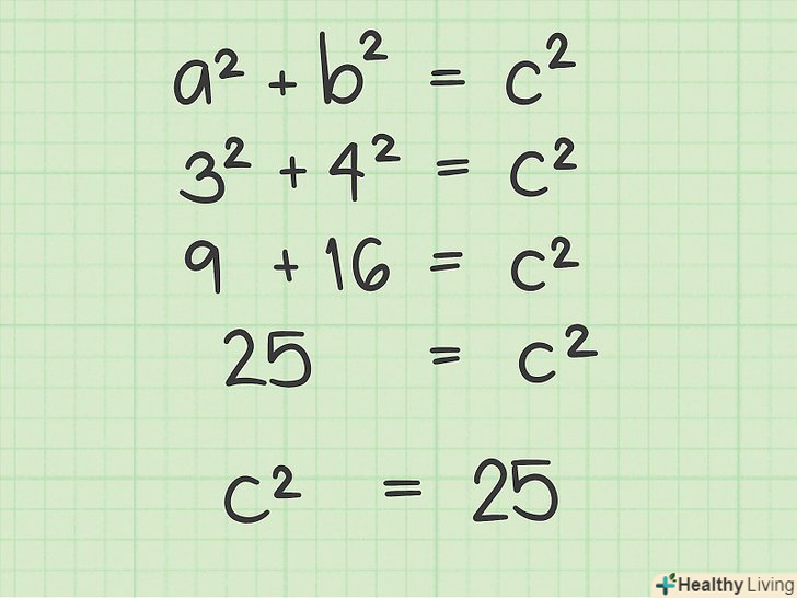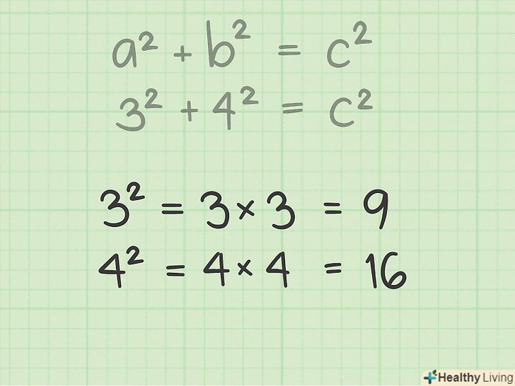 Зведіть в квадрат значення катетів (»a «і»b").для цього просто помножте число саме на себе: Зведіть в квадрат значення катетів (»a «і»b").для цього просто помножте число саме на себе:- Якщо a = 3, ТО a2 = 3 x 3 = 9. Якщо b = 4, то b2 = 4 x 4 = 16.