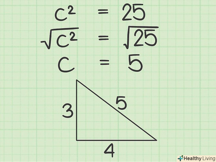 Знайдіть квадратний корінь з2 .використовуйте калькулятор, щоб витягти квадратний корінь зі знайденого значення. Так ви обчислите гіпотенузу трикутника. Знайдіть квадратний корінь з2 .використовуйте калькулятор, щоб витягти квадратний корінь зі знайденого значення. Так ви обчислите гіпотенузу трикутника.- У нашому прикладіЗ2 = 25 . Квадратний корінь з 25 дорівнює 5 (так як 5 х 5 = 25, тому √25 = 5). Це означає, що гіпотенуза С = 5.