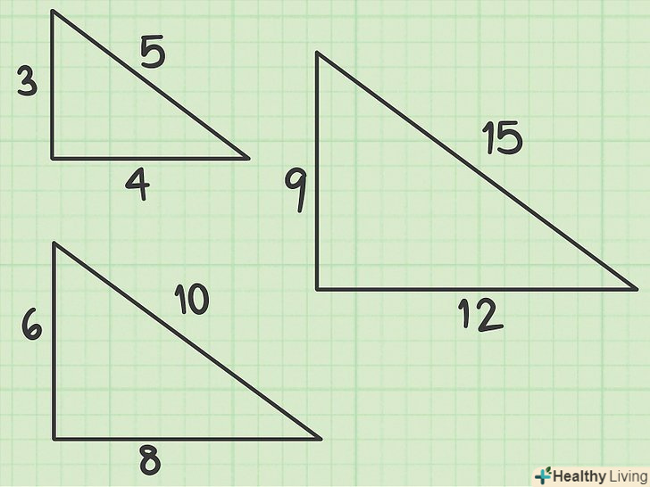 Визначення піфагорової трійки. піфагорова трійка - це три числа — довжини трьох сторін), які задовольняють теоремі Піфагора. Дуже часто трикутники з такими сторонами наводяться в підручниках і на тестах. Якщо ви запам'ятаєте перші кілька піфагорових трійок, ви заощадите багато часу на тестах або іспитах, тому що зможете обчислити гіпотенузу, просто поглянувши на довжини катетів.[4] Визначення піфагорової трійки. піфагорова трійка - це три числа — довжини трьох сторін), які задовольняють теоремі Піфагора. Дуже часто трикутники з такими сторонами наводяться в підручниках і на тестах. Якщо ви запам'ятаєте перші кілька піфагорових трійок, ви заощадите багато часу на тестах або іспитах, тому що зможете обчислити гіпотенузу, просто поглянувши на довжини катетів.[4]- Перша піфагорова Трійка:3-4-5 (32 + 42 = 52, 9 + 16 = 25). Якщо дано трикутник з катетами 3 і 4, то ви можете з упевненістю заявити, що гіпотенуза дорівнює 5 (без необхідності робити будь-які розрахунки).