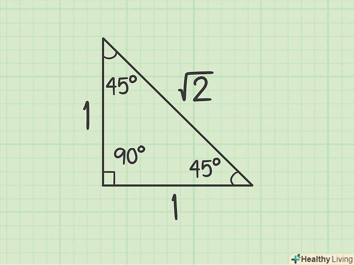 Рівнобедрений прямокутний трикутник.це такий трикутник, кути якого рівні 45,45 і 90 градусам. Співвідношення між сторонами цього трикутника дорівнює 1:1:√2. Це означає, що гіпотенуза в такому трикутнику дорівнює добутку катета і квадратного кореня з 2. Рівнобедрений прямокутний трикутник.це такий трикутник, кути якого рівні 45,45 і 90 градусам. Співвідношення між сторонами цього трикутника дорівнює 1:1:√2. Це означає, що гіпотенуза в такому трикутнику дорівнює добутку катета і квадратного кореня з 2.- Щоб обчислити гіпотенузу такого трикутника, просто помножте довжину будь-якого катета на √2.[5]