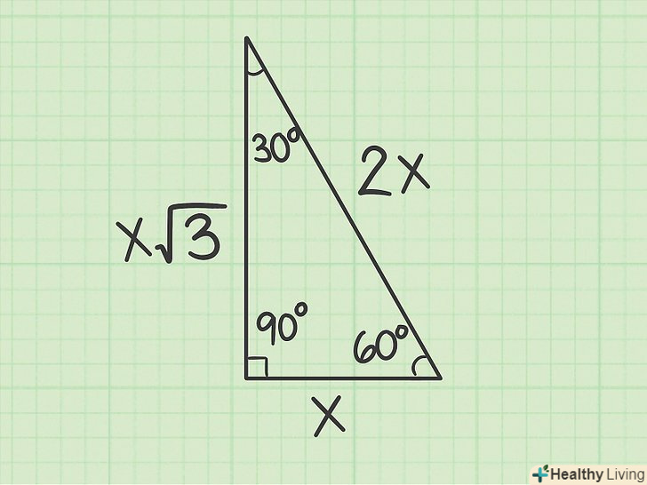 Половина рівностороннього прямокутного трикутника.це такий трикутник, кути якого рівні 30,60 і 90 градусам. Співвідношення між сторонами цього трикутника одно 1:√3:2або Х:х√3: 2х. Щоб знайти гіпотенузу в такому трикутнику виконайте одну з наступних дій:[6] Половина рівностороннього прямокутного трикутника.це такий трикутник, кути якого рівні 30,60 і 90 градусам. Співвідношення між сторонами цього трикутника одно 1:√3:2або Х:х√3: 2х. Щоб знайти гіпотенузу в такому трикутнику виконайте одну з наступних дій:[6]- Якщо вам дано короткий катет (протилежний кутку в 30 градусів), просто помножте довжину цього катета на 2, щоб знайти довжину гіпотенузи. Наприклад, якщо короткий катет дорівнює4, то гіпотенуза дорівнює 8.