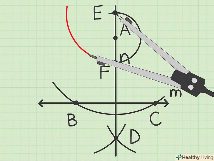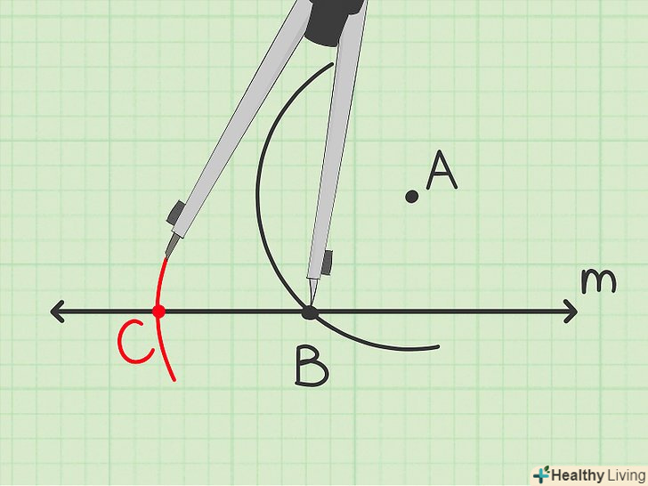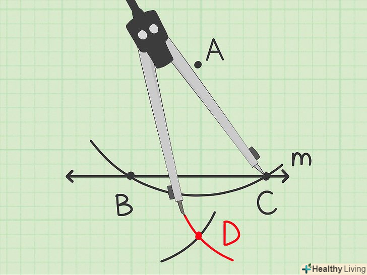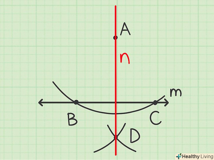 Проведіть другу дугу.не змінюючи розчину циркуля, встановіть його голку в даний точці. Проведіть дугу, яка перетне січну пряму над даною точкою і піде трохи нижче даної точки.- Наприклад, встановіть голку циркуля в точці