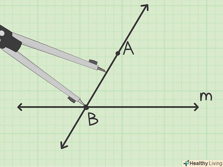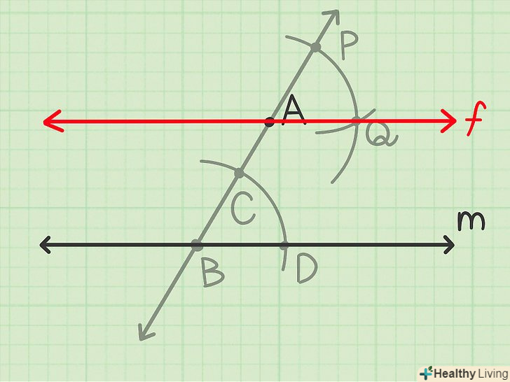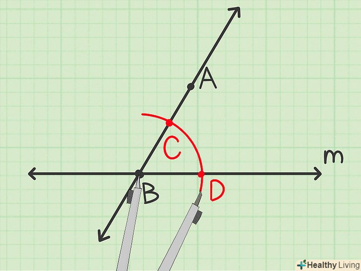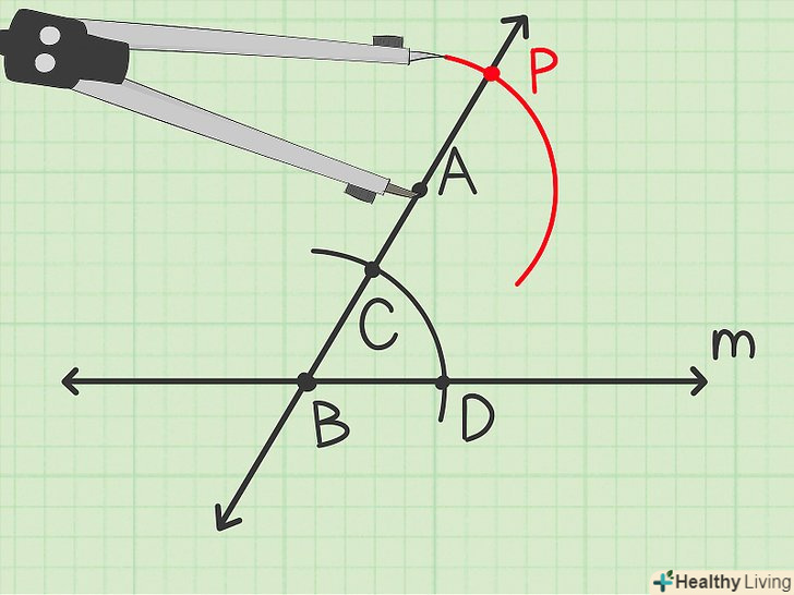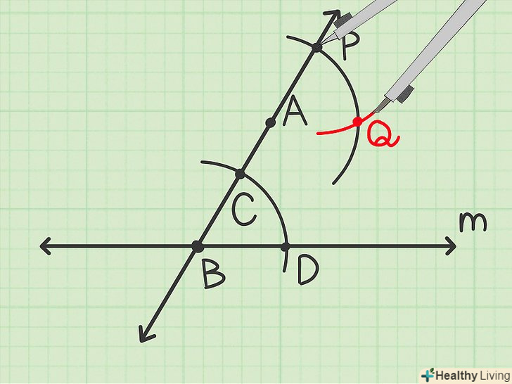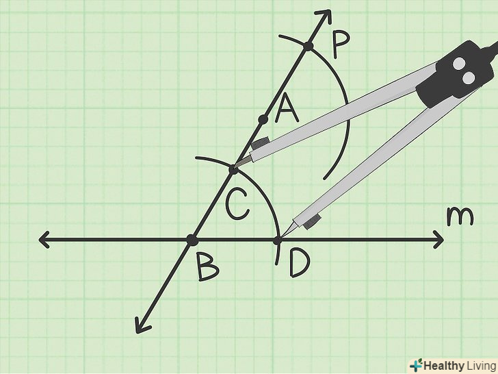 Побудуйте відповідний кут.розчин циркуля повинен дорівнювати ширині першого кута. Встановіть голку циркуля в точці, яка лежить на січній прямій над даною точкою, і проведіть дугу, яка перетне другу дугу.- Наприклад, встановіть голку циркуля в точці