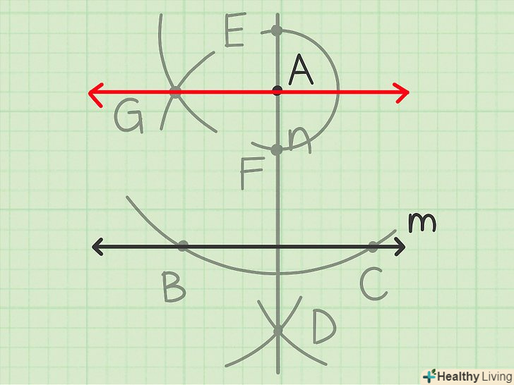 Проведіть пряму через точку перетину двох дуг і дану точку. отримана пряма буде перпендикулярна прямій. [3] таким чином, отримана пряма паралельна даній прямій
