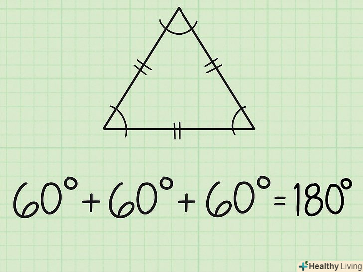 Знайдіть третій кут рівностороннього трикутника. у рівносторонньому трикутнику всі сторони рівні і всі кути рівні. Це означає, що будь-який кут в рівносторонньому трикутнику дорівнює 60°. Перевірте це: 60° + 60° + 60° = 180°.