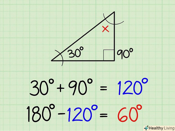 Знайдіть третій кут прямокутного трикутника.наприклад, дано прямокутний трикутник, в якому один з кутів дорівнює 30°. Якщо це прямокутний трикутник, то один з його кутів дорівнює 90°. Все, що вам потрібно зробити, це скласти відомі кути (30° + 90° = 120°) і відняти цю суму з 180°, тобто 180° - 120° = 60°. Третій кут дорівнює 60°.