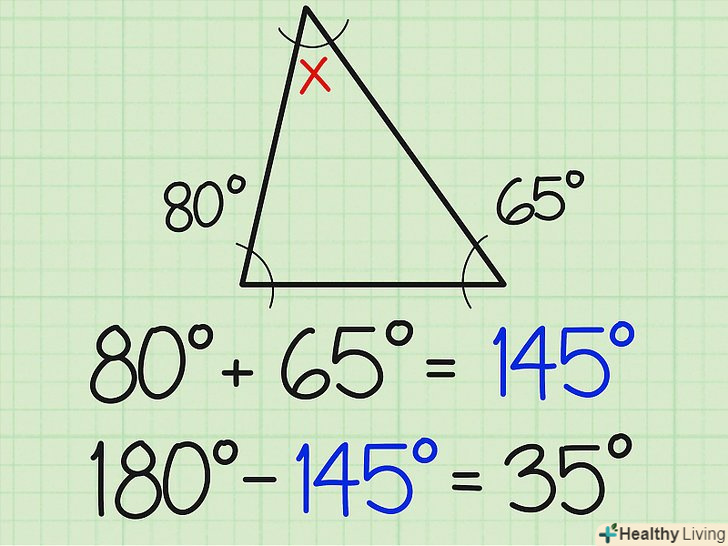 Складіть відомі значення двох кутів.Запам'ятайте: сума кутів в трикутнику завжди дорівнює 180°. Тому, якщо ви знаєте два з трьох кутів трикутника, то ви легко обчислите третій кут. Перше, що потрібно зробити, - це скласти відомі значення двох кутів. Наприклад, дані кути 80° і 65°. Складіть їх: 80° + 65° = 145°.