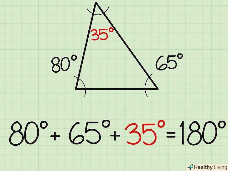 Запишіть відповідь.тепер ви знаєте, що третій кут дорівнює 35°. Якщо ви сумніваєтеся, просто перевірте відповідь. Сума трьох кутів повинна бути дорівнює 180°: 80° + 65° + 35° = 180°.