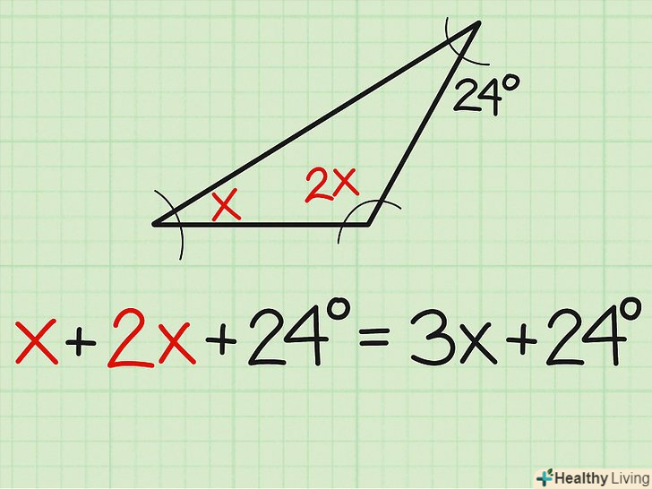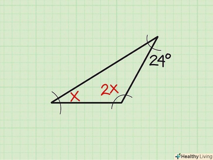 Запишіть завдання.іноді замість точних значень двох кутів трикутника в задачі дано тільки кілька змінних, або змінні і значення кута. Наприклад: знайдіть кут "х", якщо два інших кута трикутника рівні 2x і 24°.