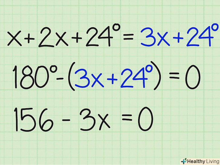 Відніміть суму з 180°.Прирівняйте отримане рівняння до 0. Ось як це робиться:- 180° - (3x + 24°) = 0