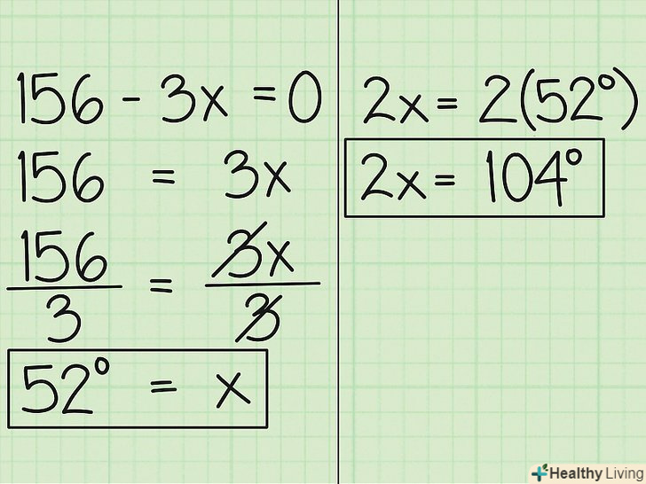 Знайдіть х. для цього відокремте члени зі змінною на одній стороні рівняння, а числа – на іншій: 156° = 3x.тепер розділіть обидві частини рівняння на 3, щоб отримати х = 52°. Це означає, що третій кут трикутника дорівнює 52°. Інший кут, даний в умові як 2x, дорівнює: 2*52° = 104°.