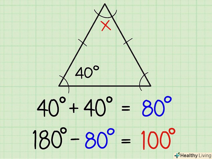 Знайдіть третій кут рівнобедреного трикутника.рівнобедрені трикутники мають дві рівні сторони і два рівних кута, прилеглих до цих сторін. Якщо ви знаєте один з рівних кутів в рівнобедреному трикутнику, то ви можете знайти кут між рівними сторонами. Ось як це зробити:- Якщо один з рівних кутів 40°, то й інший рівний кут 40°. Ви можете знайти третій кут, віднімаючи суму 40° + 40° = 80° з 180°: 180° - 80° = 100°.