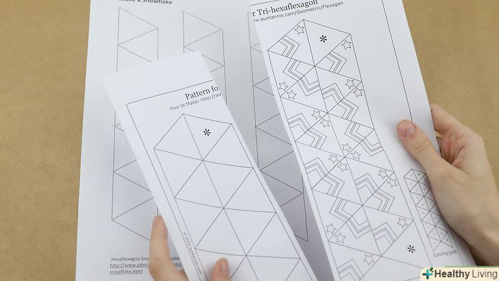 РоздрукуйтеШаблон флексагону.різні шаблони флексагонів можна знайти в мережі, виконавши відповідний пошуковий запит по фразах "флексагон", "флексагон з трьома поверхнями"або" флексагон з шістьма поверхнями". У результатах пошуку Ви знайдете шаблони з різними поєднаннями візерунків. Виберіть серед них те, що вам підійде найкраще, і роздрукуйте.[2]- Також можна роздрукувати чистий шаблон, щоб потім розфарбувати флексагон на свій розсуд.