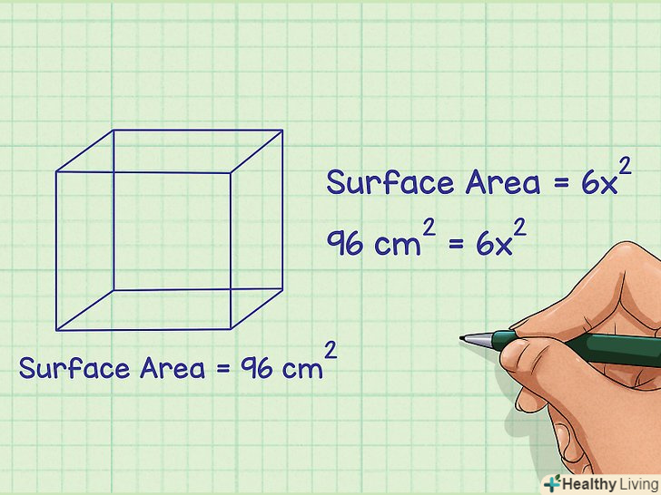У формулу підставте значення площі поверхні куба.площа поверхні повинна бути дана в задачі.- Якщо площа поверхні куба невідома, не користуйтеся цим методом.