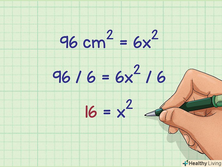 - Наприклад, якщо площа поверхні куба дорівнює 96 см2, розділіть 96 на 6:
