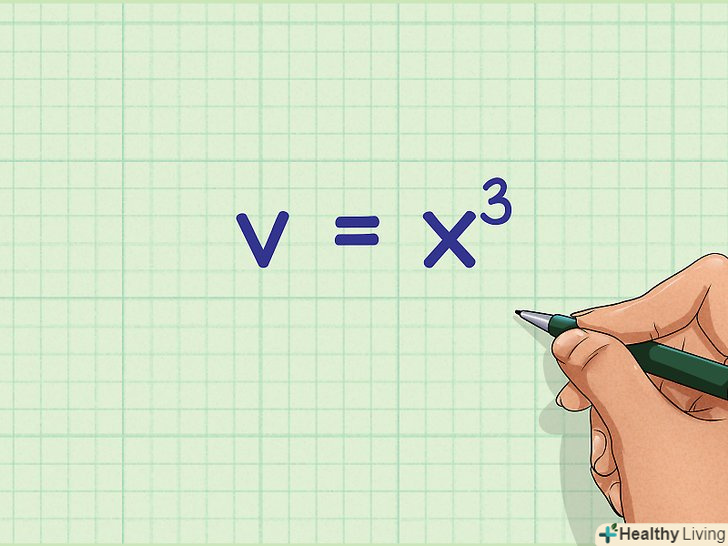 - Щоб обчислити обсяг куба, потрібно перемножити значення трьох його ребер (довжину, ширину і висоту).[3] у куба довжина, ширина і висота рівні, тому потрібно знайти значення одного (будь-якого) ребра, щоб обчислити обсяг куба. Майте на увазі, що для обчислення площі поверхні куба потрібно знати значення ребра; тому, якщо площа поверхні куба дана, ви з легкістю знайдете його ребро, а потім обчисліть обсяг куба.