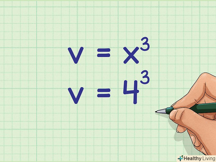 Зведіть в куб (в третю ступінь) значення ребра куба.зробіть це на калькуляторі або просто помножте «x» на себе три рази. Так ви знайдете обсяг куба в кубічних одиницях виміру.- Наприклад, якщо ребро куба дорівнює 4 см, обчислення запишуться так: